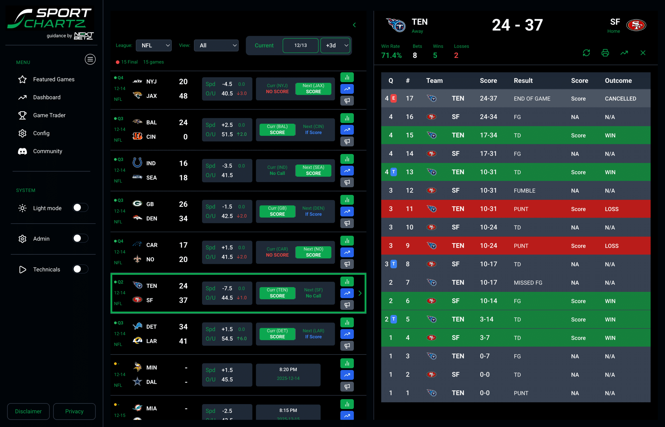 Live markets demand precision and timing. SportChartz brings that same trading mindset to live sports, turning every drive into a decision backed by real data.