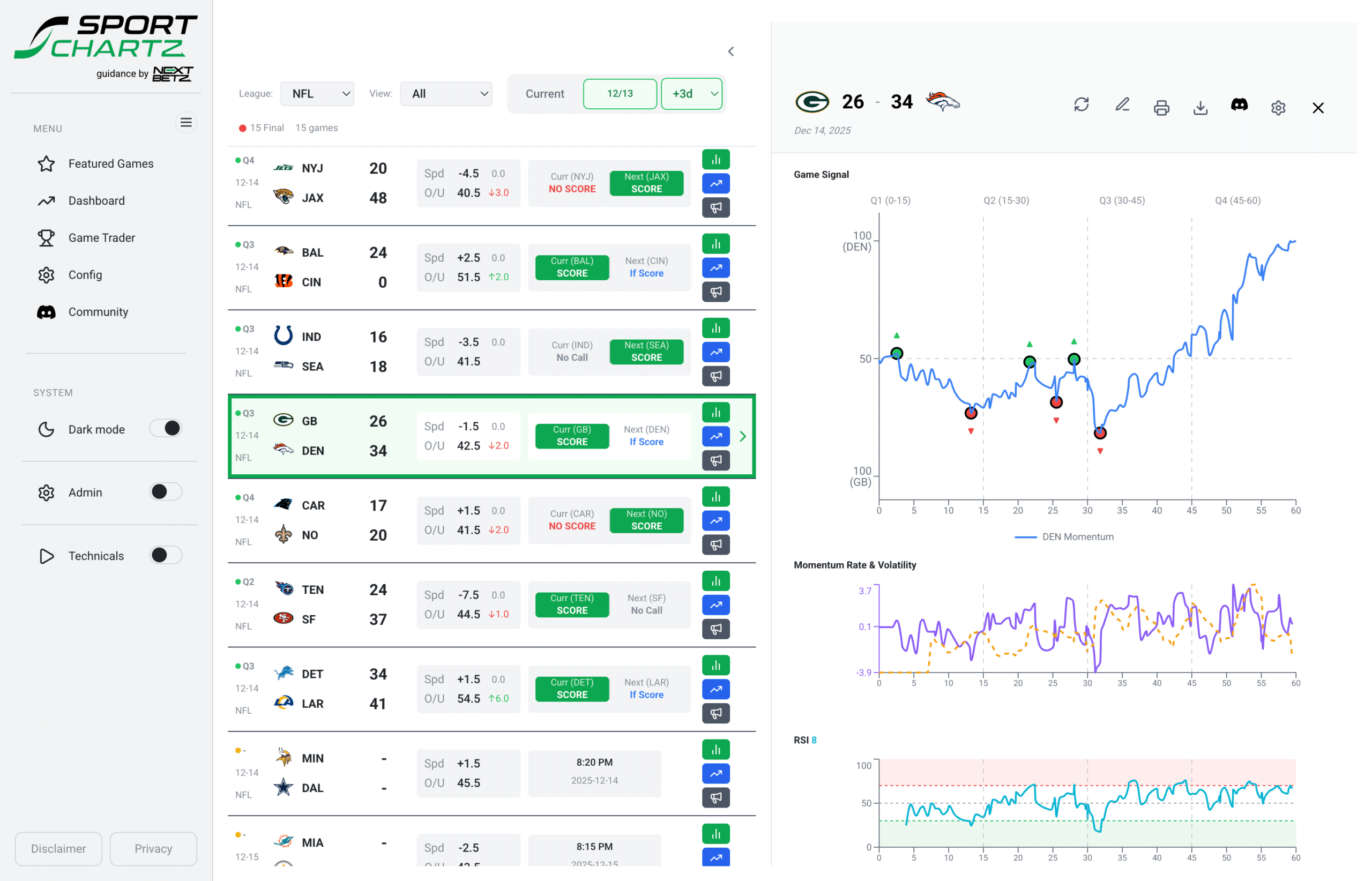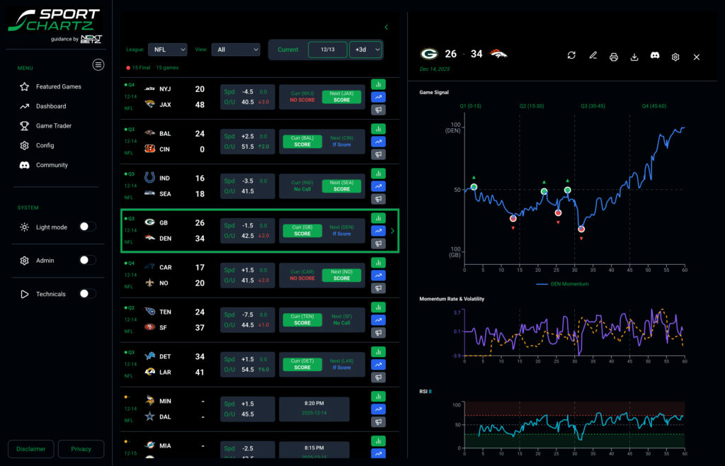 From drives and scoring to full games and upcoming ones, SportChartz helps you evaluate opportunity, momentum, and risk using the same technical mindset day traders apply to stocks, commodities, and crypto.